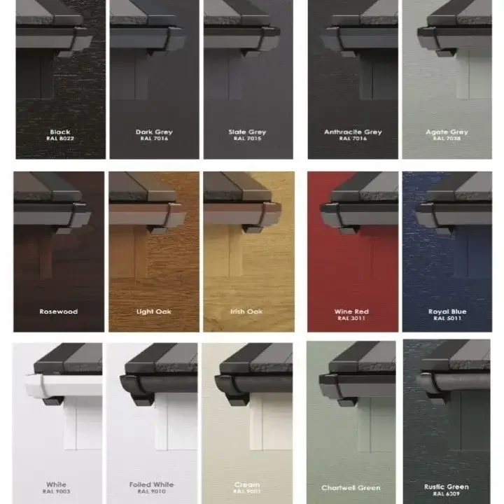 We offer all Gutter Types: Half Round, Squareline, Deep Flow, Extra Flow, and Ogee in colours like White, Brown, Black, Anthracite Grey, Light Grey, and Cast Iron Effect. Downpipes come in round or square to match your guttering.
